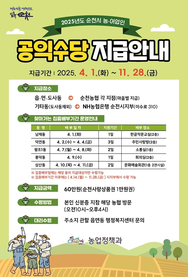 농어민 공익수당은 연 60만 원이 지급되며, 지역경제 활성화를 위해 순천사랑상품권으로 제공된다. 올해 순천시 공익수당 지급 대상자는 총 15,718명이며, 예산 규모는 약 94억 원에 달한다.