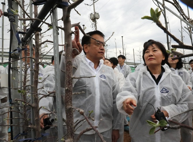 최 부총리는 이날 송미령 농림축산식품부 장관과 사과 과수원 '내포농원'을 방문해 사과 개화기 생육 상황과 스마트 과수원 조성 현황을 점검했다.