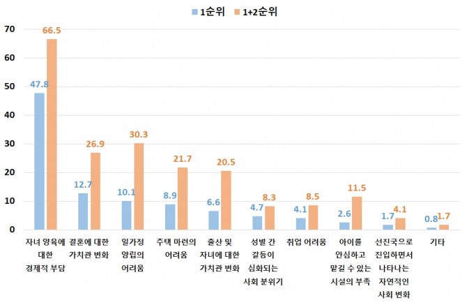 저출산 문제 해결을 위한 정책으로는 ‘여성의 사회활동과 육아가 가능한 일가정양립 지원’(30.1%), ‘청년층이 결혼을 늦추거나 하지 못하는 원인 해소’(29.2%)를 주요하게 꼽았다.