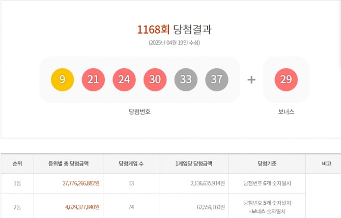 이미지 확대보기로또복권 운영사 동행복권은 제1168회 로또복권 추첨에서 '9, 21, 24, 30, 33, 37'이 1등 당첨번호로 뽑혔다고 19일 밝혔다.