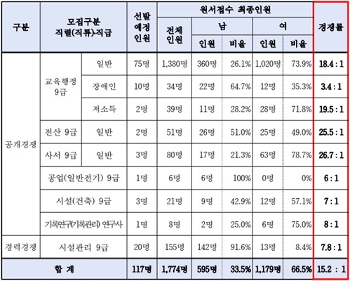 사회적 약자의 공직 진출 기회를 확대·보장하기 위한 저소득층 모집에서는 △교육행정9급(저소득) 19.5대 1, 장애인 모집에서는 △교육행정 9급(장애인) 3.4대 1의 경쟁률을 각각 보였다.