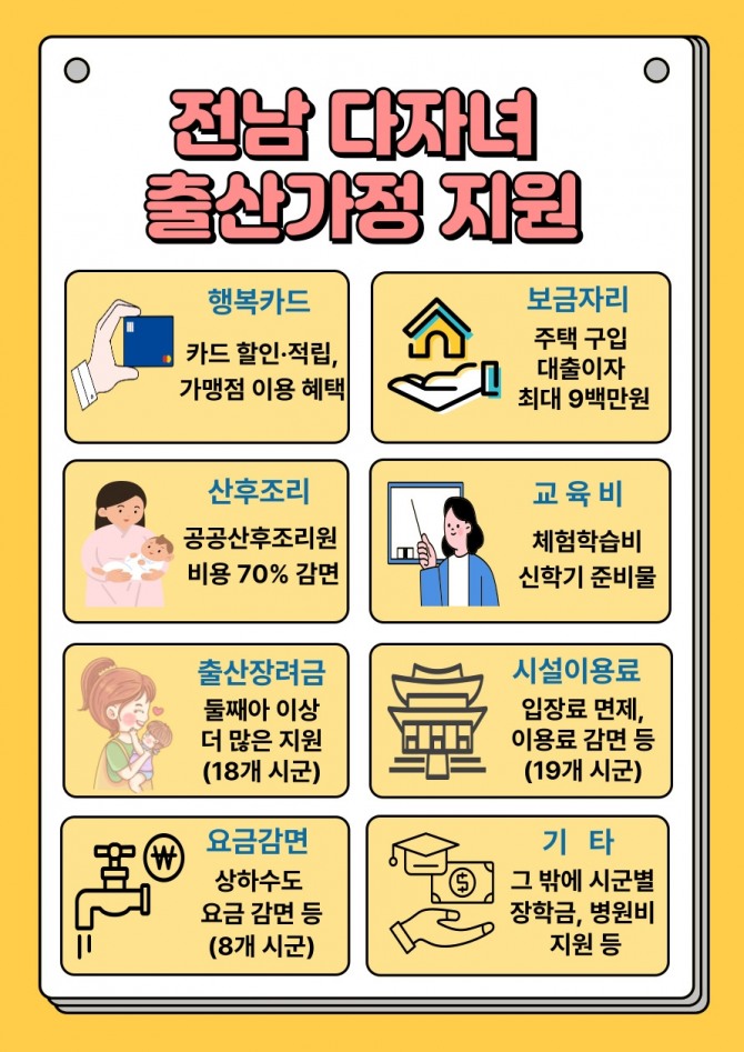 이에 전남도는 다자녀 출산을 장려하기 위해 지원사업 52건(도 5·시군 47), 시설할인 74건(도 8·시군 66) 등 총 126건의 사업을 추진한다.