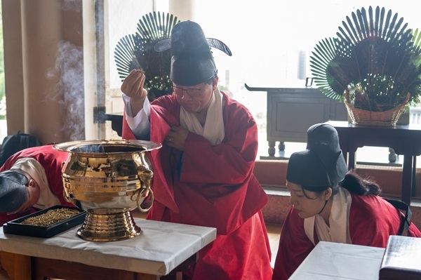 김석준 부산광역시교육감이 지난 25일 오전 10시 부산시 동래구 충렬사에서열린 ‘임진왜란 제433주년 충렬사 제향 봉행’ 행사에서 초헌관을 맡아 재배와 분향, 헌작 등을 하고 있다. 아헌관은 윤흥신 장군 후손인 윤태석 등 2명이 맡았다. 이 행사에는 이준승 부산시 행정부시장과 지역 국회의원, 부산시의회 의원 등이 참가했다.