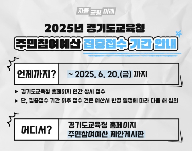 이미지 확대보기이번 접수는 2026년도 경기도교육비특별회계 예산편성에 도민의 목소리를 적극 반영하기 위해 마련됐다.