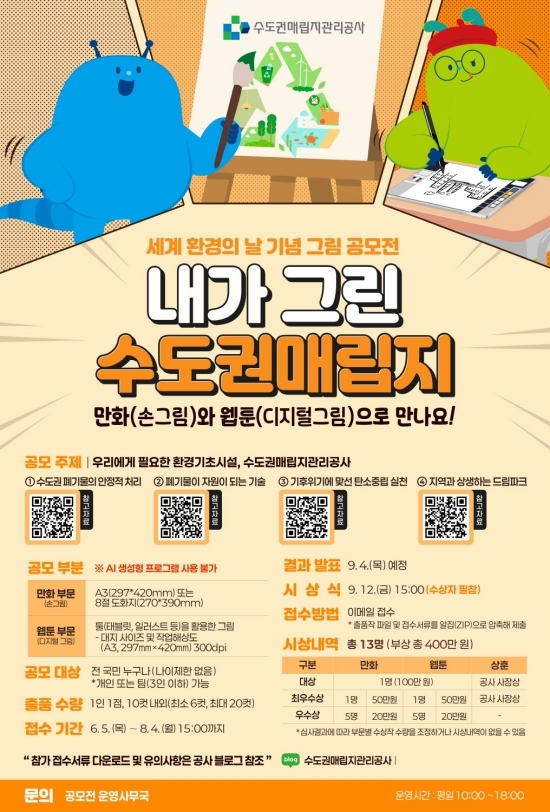 이미지 확대보기이번 공모전은 국민 누구나 참여할 수 있다. △수도권 폐기물의 안정적 처리 △폐기물이 자원이 되는 기술 △기후위기에 맞선 탄소중립 실천 △지역과 상생하는 드림파크 등 네 가지 주제 중 하나를 택해 만화(손그림) 또는 웹툰(디지털 그림) 형식으로 표현하면 된다.