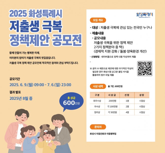 이미지 확대보기이번 공모전은 지난 4월 실시된 ‘화성특례시 저출생 정책 설문조사’ 결과를 토대로 시민 수요가 높은 경제지원과 돌봄·양육환경 개선 분야의 실효성 있는 정책을 발굴하기 위해 기획됐다.