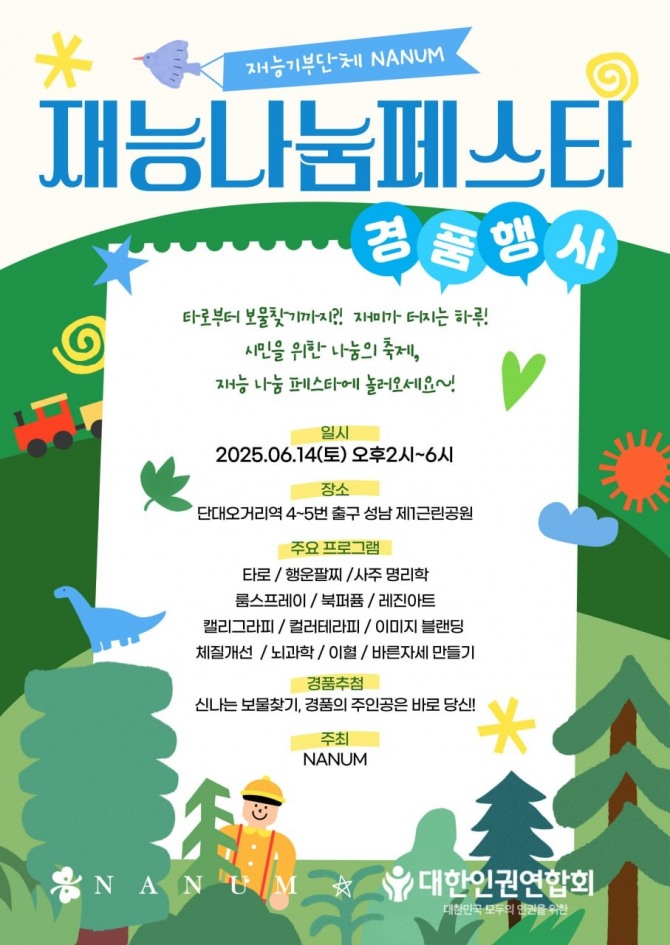 이미지 확대보기재능기부 비영리단체 ‘나눔’과 대한인권연합회는 오는 14일 오후 2시부터 6시까지 성남 제1근린공원에서 ‘재능 나눔 페스타’를 개최해 시민들에게 풍성한 문화체험 기회를 선사한다.