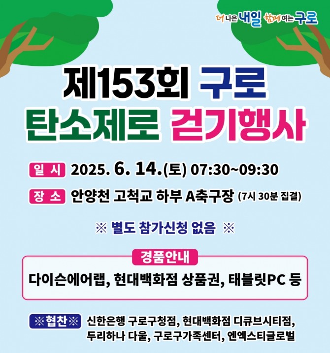 장인홍 구로구청장은 “이번 걷기 행사는 일상 속 환경보호 실천과 공동체 화합의 장이 될 것”이라며“많은 주민들이 참여해 자연과 건강의 가치를 함께 누리시길 바란다”고 밝혔다.