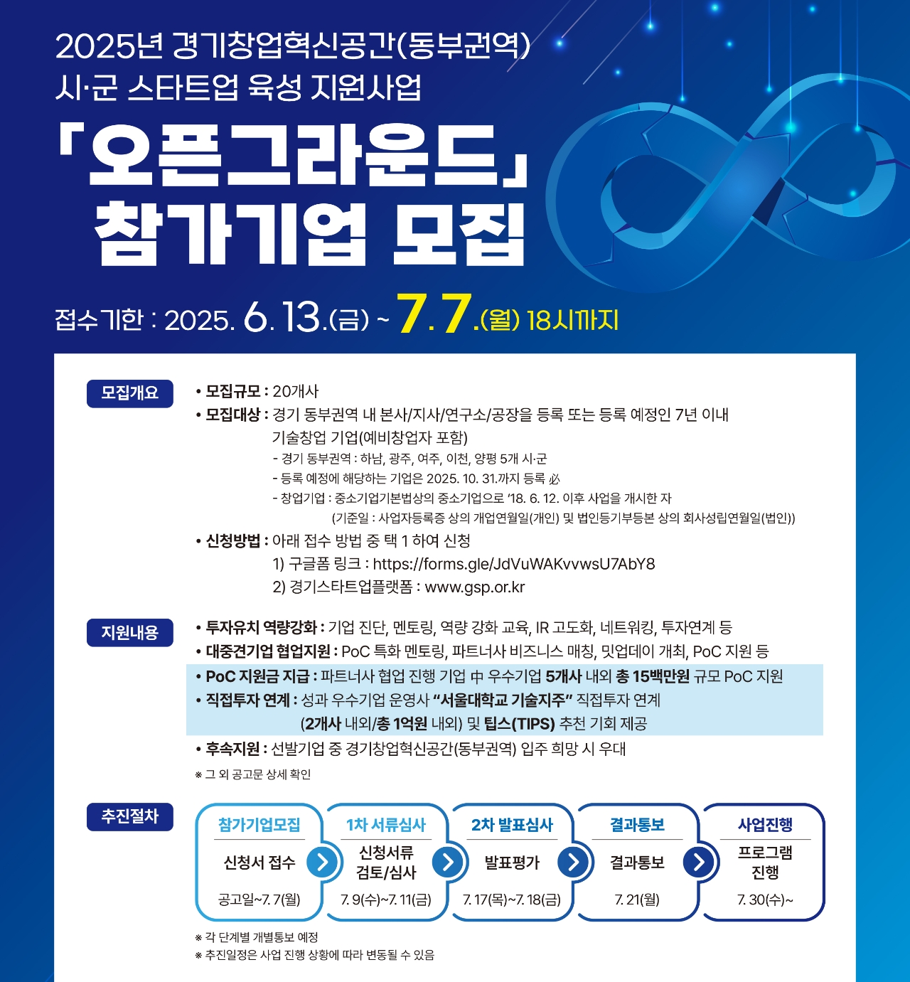 박양덕 경기도 벤처스타트업과장은 “오픈그라운드는 단순 지원을 넘어 창업기업과 대기업이 지속적인 네트워크를 형성하고 함께 성장할 수 있는 플랫폼”이라며 “동부권 창업 생태계의 활성화와 지속 가능한 성장 기반 마련에 최선을 다하겠다”고 밝혔다.