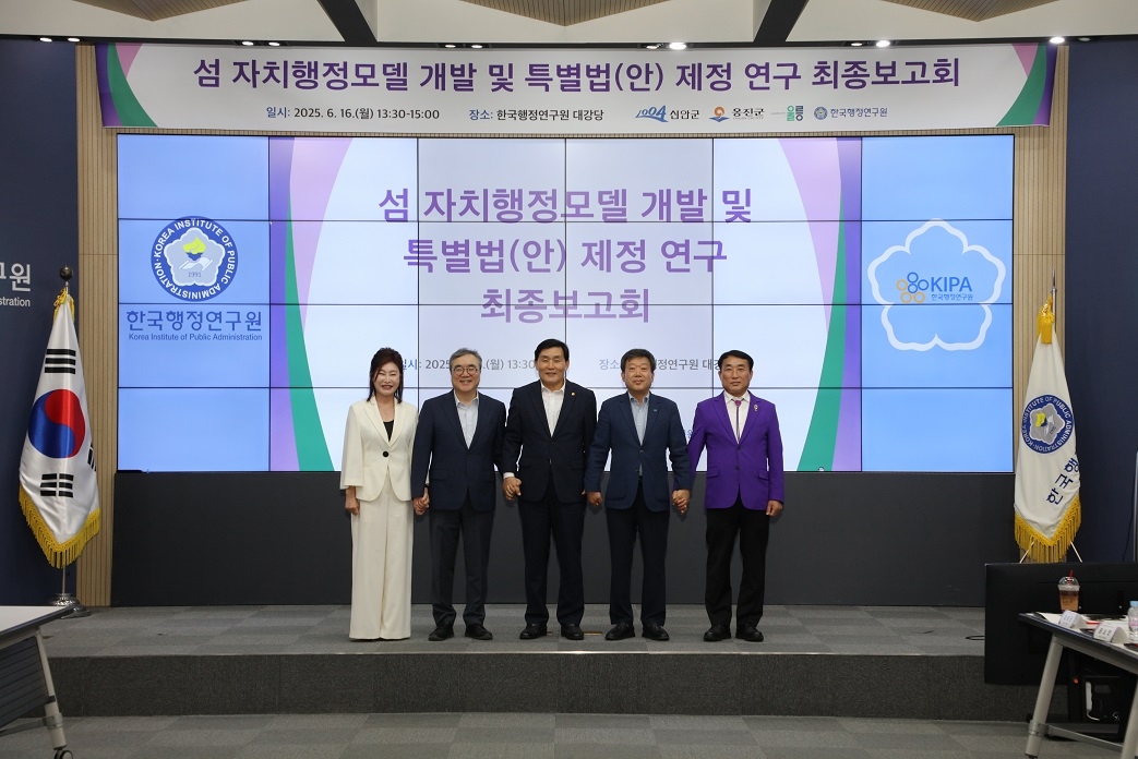 이미지 확대보기이번 보고회에는 김대인 신안군수 권한대행, 문경복 옹진군수, 남한권 울릉군수를 비롯한 3개 군 관계 공무원과 한국행정연구원 연구진이 참석한 가운데 진행됐으며, 지난 1년간의 연구 성과와 ‘특별자치군의 설치 및 규제특례도서의 개발 등에 관한 법률(안)’에 대해 심도 있는 논의를 진행했다.