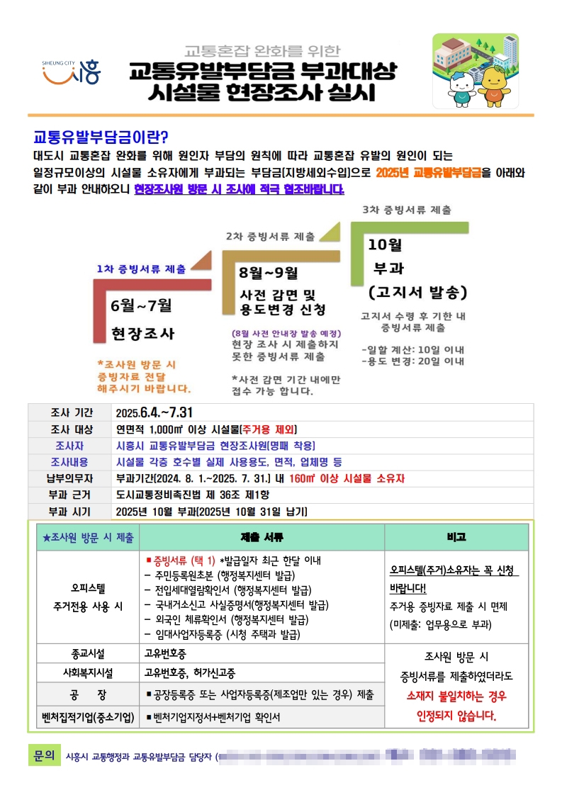 이미지 확대보기이번 조사는 ‘도시교통정비 촉진법’ 제36조에 따라 진행된다. 이에 연면적 1000㎡ 이상 시설물 중 소유 면적이 160㎡ 이상인 소유자에게 교통유발부담금을 부과하기 위한 사전 절차다.