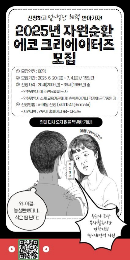 한편, 인천시는 지난해에도 ‘에코 크리에이터즈’ 2명을 선발해 홍보 콘텐츠 10건 제작, 자원순환센터 견학, 활동실적 발표회 등 활동을 진행한 바 있다.