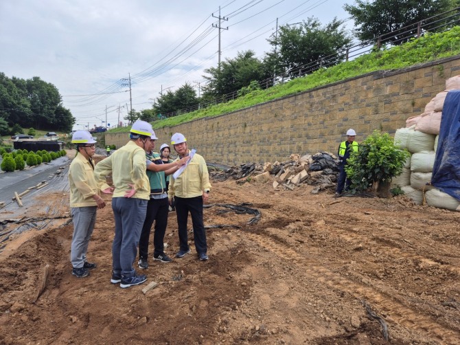 이미지 확대보기24일 박승삼 시흥시 부시장이 최근 집중호우로 붕괴한 미산동 시민교회 인근 보강토 옹벽 복구 현장과 미산동 솔숲공원에 마련된 폭염 대비 물놀이 시설을 잇달아 방문해 안전 점검을 하고 있다. 사진=시흥시 박승삼 시흥시 부시장은 24일 최근 집중호우로 붕괴한 미산동 시민교회 인근 보강토 옹벽 복구 현장과 미산동 솔숲공원에 마련된 폭염 대비 물놀이 시설을 잇달아 방문해 안전 점검을 하고 관계자들을 격려했다.
