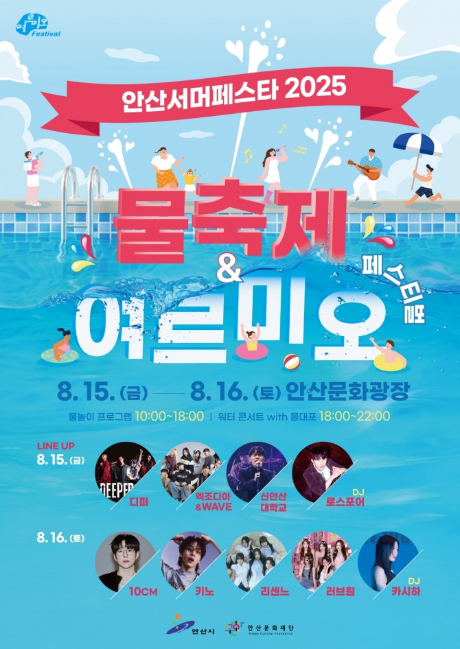 물놀이 프로그램은 오전10시부터 오후6시까지 안산문화광장 일대에서 진행되며 여르미오페스티벌 음악 콘서트 with 물대포는 오후6시부터 10시까지 안산문화광장 브릿지광장에서 펼쳐질 예정이다.