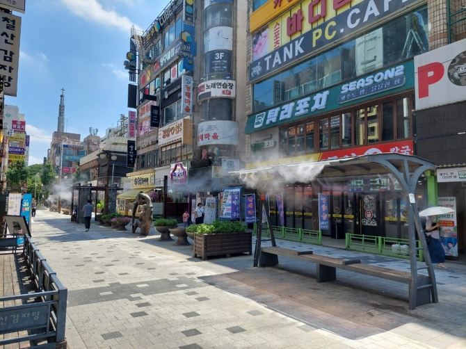 이미지 확대보기쿨링포그(cooling fog)는 정수 처리한 수돗물을 특수 노즐을 사용해 미세 안개로 분사하는 장치로 분사된 안개가 더운 공기와 만나 기화하면서 주위 온도를 약 3~5℃ 정도 낮추는 효과가 있으며, 미세먼지 저감에도 도움을 준다.