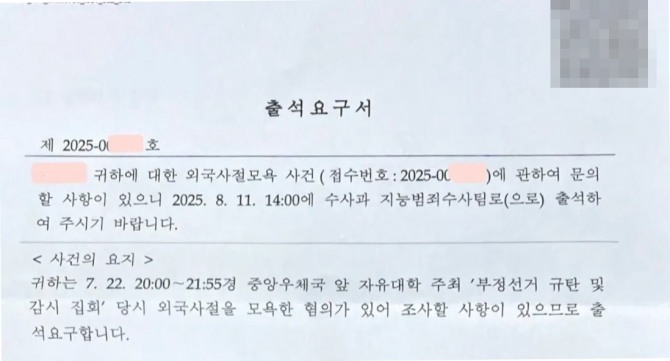 이미지 확대보기9일 뉴시스 등 복수 매체 취재에 따르면 서울 남대문경찰서는 자유대학 관계자에게 오는 11일 경찰에 출석해 조사를 받을 것을 요구하는 출석요구서를 발송했다. 자유대학은 지난달 22일 오후 8시께 서울 중구 주한중국대사관 인근에서 ‘부정선거 규탄 및 감시 집회’를 열었으며, 이 과정에서 시진핑 중국 국가주석과 주한중국대사 다이빙의 얼굴이 인쇄된 중국 국기 현수막을 찢는 등 대사관 측을 모욕한 혐의를 받고 있다.