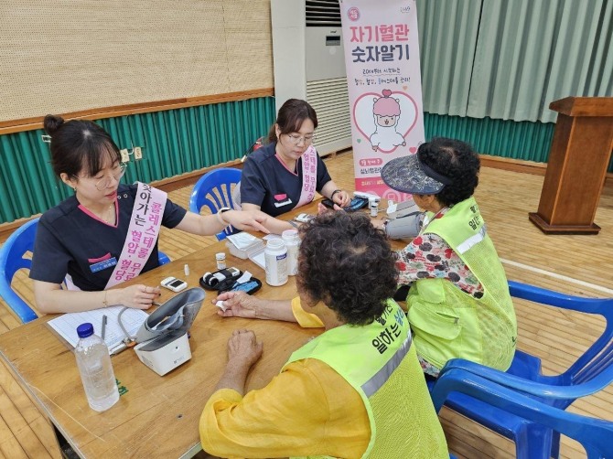 어르신들의 건강관리를 위해 심뇌혈관질환 예방 및 관리 일환으로 뇌졸중과 심근경색의 조기 증상 인지 방법을 안내하고, 혈압 및 혈당 측정 검사를 진행했다.