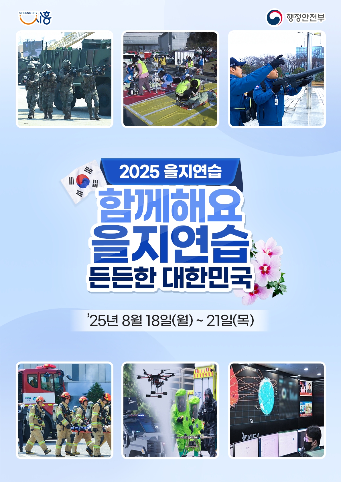 오는 19~21일에는 가상의 적 공격 상황을 부여해 이를 처리하는 도상연습과 20일에는 시흥시 전역에서 공습 대비 민방공 대피훈련이 진행되며, 21일에는 전시현안과제 토의와 최종 강평회를 끝으로 2025년 을지연습이 마무리된다.