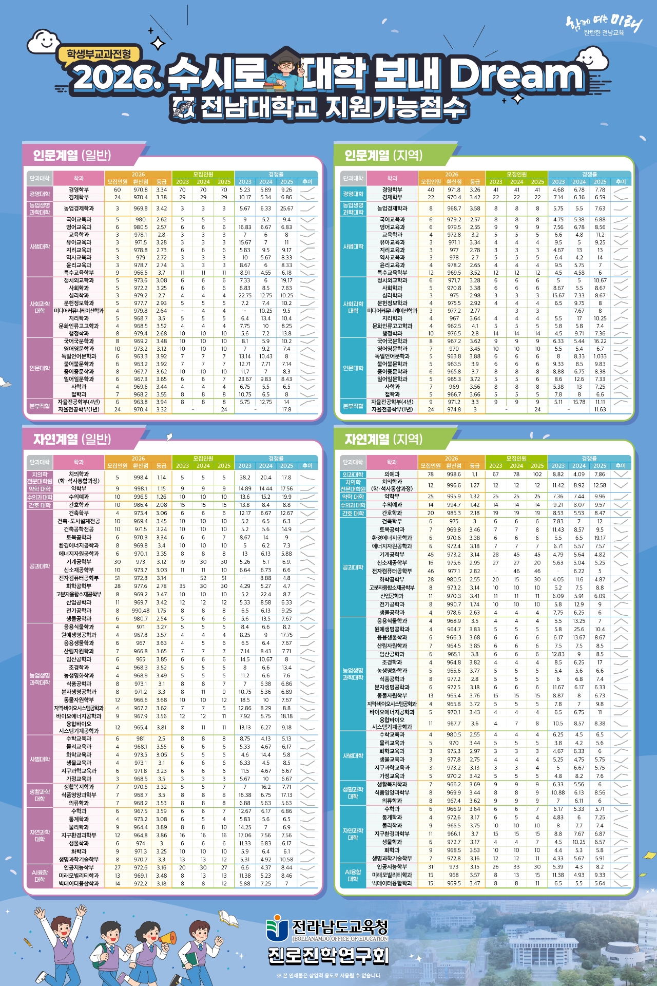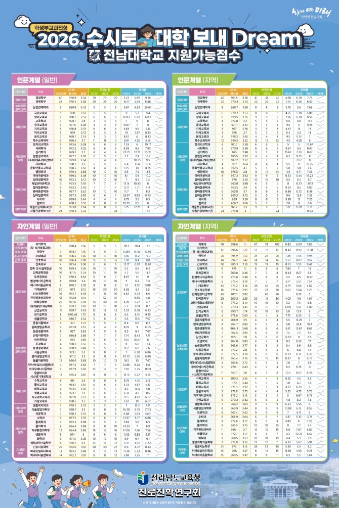 이미지 확대보기‘2026. 대입일정 정리해 DREAM’은 원서 접수, 합격자 발표, 대학별 전형 일정 등 주요 대입 일정을 한눈에 볼 수 있도록 정리한 것이며, ‘2026학년도 수시로 대학 보내 DREAM’은 서울 주요 대학, 의약학계열, 전남대 교과전형의 합격 가능 등급 및 교과 환산 점수를 예측한 자료이다.