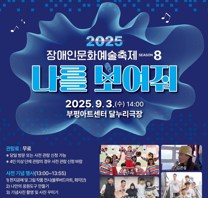이미지 확대보기인천 부평구 부평장애인종합복지관은 오는 9월 3일 부평아트센터 달누리극장에서 2025년 장애인문화예술축제 ‘나를 보여줘-시즌8’을 개최한다고 19일 밝혔다.
