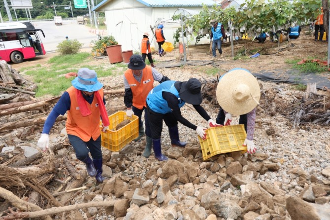 이미지 확대보기공사 임직원 7명은 지난달 30일 가평군 상면의 한 포도 농가를 찾아 토사와 바위 등을 제거하는 활동을 통해 수재민의 일상 회복을 도왔다. 이어 이달 20일에는 임직원 6명이 가평군 조종면의 한 침수 주택에서 무릎 높이까지 쌓인 토사물을 제거하는 봉사활동을 펼쳤다.