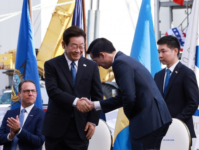 이재명 대통령과 김동관 한화그룹 부회장이 26일(현지 시각) 미국 필라델피아의 한화 필리조선소에서 열린 '스테이트 오브 메인'호 명명식에서 악수하고 있다. 사진=연합뉴스이미지 확대보기