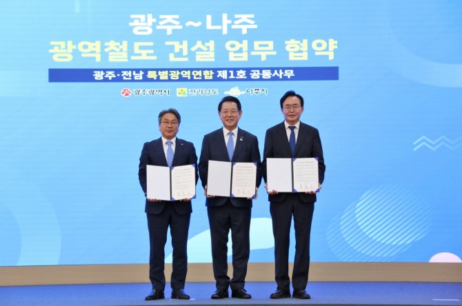 이미지 확대보기나주시는 지난 27일 광주광역시, 전라남도와 함께 ‘광주·전남 특별지방자치단체’ 출범을 선포하고 제1호 공통사무로 ‘광주~나주 광역철도 건설’을 확정했다고 28일 밝혔다.