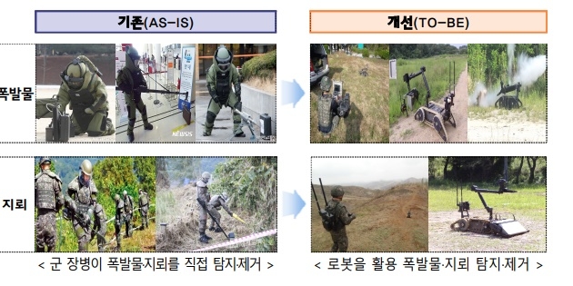 기재부는 로봇을 도입하면 국민과 병사 인명 피해를 현재 대비 15배 줄이고 지뢰탐지 속도도 3배 향상시키며 부모들이 안심할 수 있는 안전한 군 복무환경을 마련할 수 있다고 밝혔다.