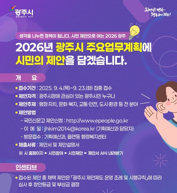 한편, 시민 아이디어 제안은 국민신문고(제안신청), 이메일, 기획예산과 및 읍·면·동 행정복지센터 방문 접수 등을 통해 가능하다. 신청 서식은 광주시청 홈페이지에서 내려받을 수 있다.