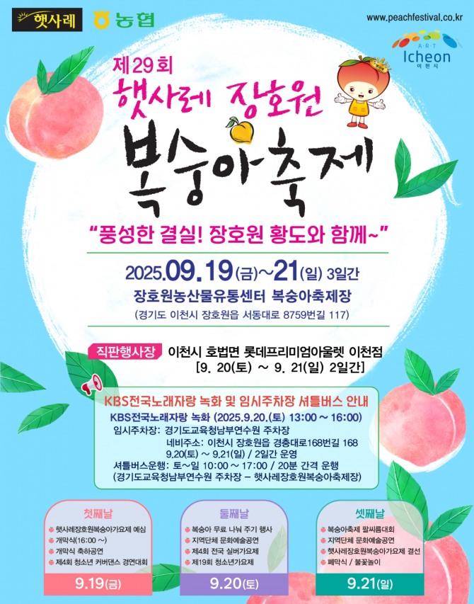 시 관계자는 “풍부한 햇살과 비옥한 토양에서 자란 햇사레 복숭아의 우수성을 널리 알리는 대표 축제로 자리매김하길 기대한다”며 “가족, 연인과 함께 이천의 가을 정취와 달콤한 복숭아를 만끽하길 바란다”고 밝혔다.