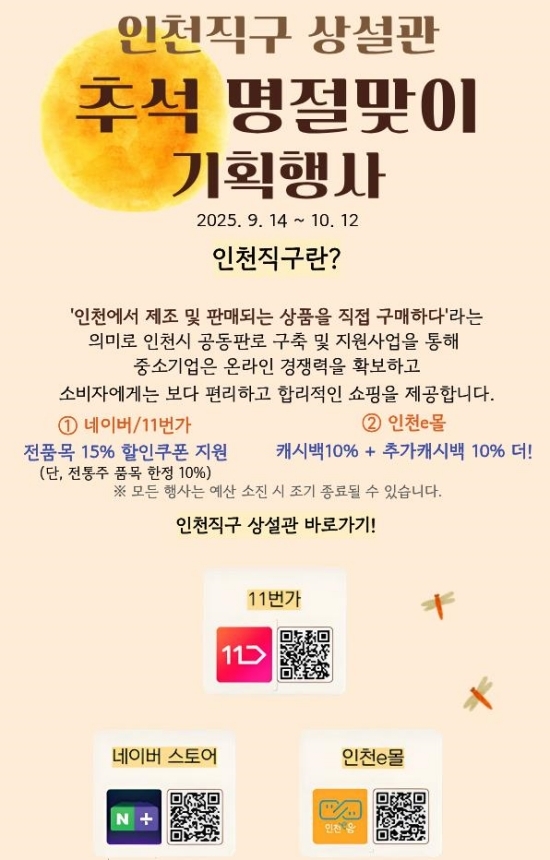 현재 인천직구 상설관 입점은 상시 모집 중이며, 시와 인천테크노파크는 10월 11일 ‘제61회 시민의 날 기념’ 행사 현장에 인천직구 홍보 부스를 운영해 온라인 할인 행사와 입점 기업의 우수 제품을 소개하고, 현장 상담과 안내를 제공할 예정이다.