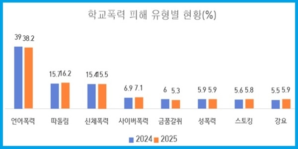 학교폭력 피해 유형은 언어폭력(38.2%), 집단따돌림(16.2%), 신체폭력(15.5%), 사이버폭력(7.1%) 순으로 조사됐다.