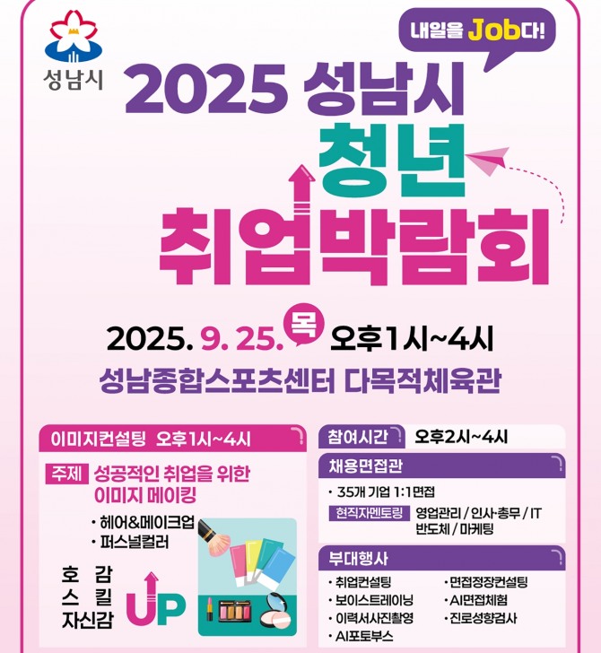 구직자는 행사 당일 현장 참여가 가능하며, 이미지 컨설팅·현직자 멘토링·보이스 트레이닝은 오는 22일 오후 6시까지 성남시일자리센터 홈페이지에서 사전 신청할 수 있다. 사전 신청자는 우선적으로 참여 기회를 보장받으며, 현장 접수자도 참여 가능하다.
