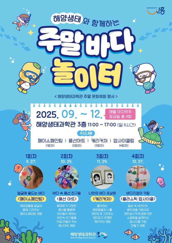 체험 프로그램은 △9월 페이스페인팅 ‘얼굴에 물드는 바다’ △10월 풍선아트 ‘바닷속 풍선 친구들’ △11월 캐리커처 ‘나만의 바다 초상화’ △12월 새 활용(업사이클링) 체험 ‘바다지킴이 열쇠고리(키링)’ 등으로 구성됐다.
