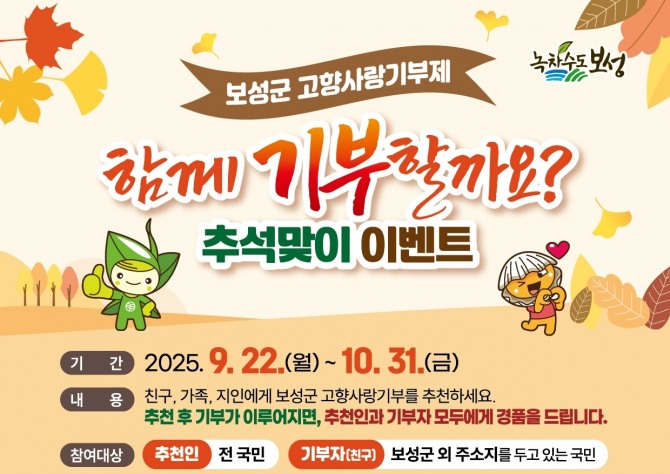 이미지 확대보기전남 보성군은 다가오는 추석을 맞아 고향사랑기부제 활성화를 위해 ‘함께 기부할까요? 추석맞이 이벤트’를 다음 달 31일까지 진행한다고 22일 밝혔다.
