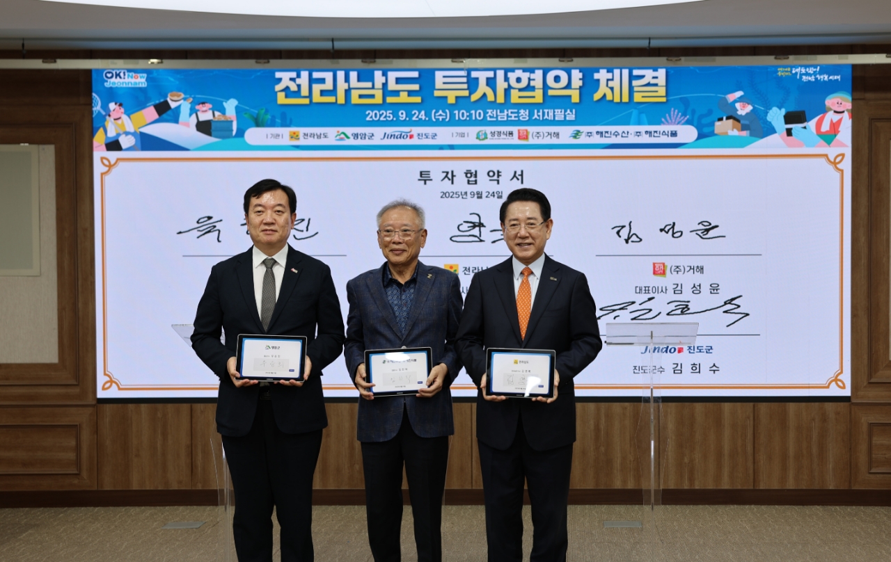 이날 협약에 따라 ㈜해진수산은 332억원을 투자해 영암군 삼호읍에 마른김 생산시설을 조성하고, 80여 명을 고용할 예정이다.