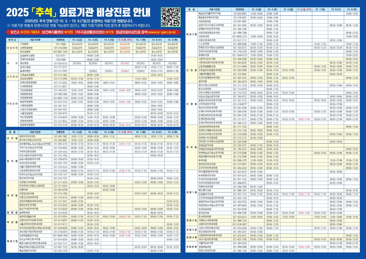 연휴 기간 중 문을 여는 의원과 약국 등 의료기관 현황은 응급의료정보센터 누리집, 시흥시청 누리집, 스마트폰 앱(App) ‘응급의료정보제공’ 및 큐알코드를 통해 확인할 수 있다.