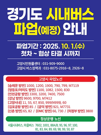 고양시 관계자는 “예고된 파업으로 시민 불편이 불가피한 만큼 마을버스, 지하철 등 대체 교통수단을 사전에 확인하고 평소보다 여유 있게 이동해 달라”며 “시도 모든 수단을 총동원해 시민 불편을 최소화하겠다”고 강조했다.