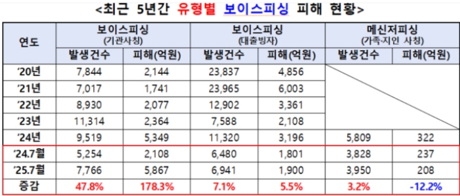 특히 2024년에는 기관사칭 피해액이 5349억원에 달했으며, 2024년 7월부터 올해 7월까지 불과 1년 만에 178% 급증했다.