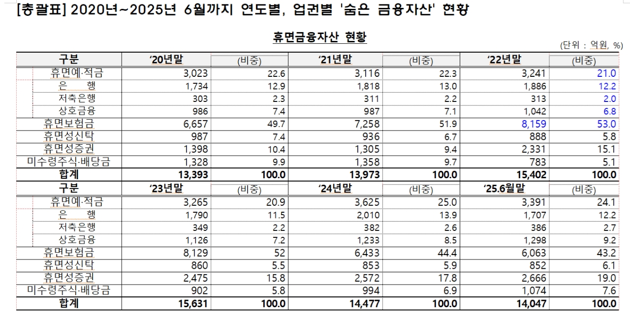 12일 국회 정무위원회 이양수 국회의원(국민의힘, 속초·인제·고성·양양)이 금융감독원에서 제출받은 자료에 따르면, 올해 6월 말 기준 장기 미거래(미청구) 자산은 14조 1,000억 원에 달하며, 이는 전체 숨은 금융자산 18조 4,000억 원의 약 76%를 차지했다.
