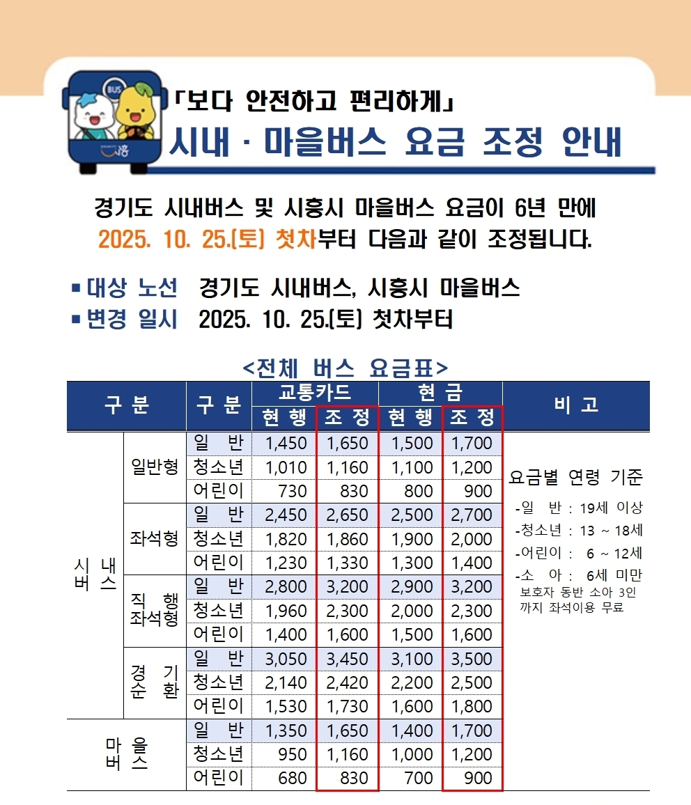 조정된 요금은 교통카드 기준으로, 경기도 시내버스 일반형의 경우 △성인 1450원에서 1650원(200원 인상)으로 △청소년 1010원에서 1160원(150원 인상)으로 △어린이 730원에서 830원(100원 인상)으로 오르게 된다. 시흥시 마을버스 요금은 △성인 1,350원에서 1650원(300원 인상)으로 △청소년 950원에서 1160원(210원 인상)으로 △어린이 680원에서 830원(150원 인상)으로 조정된다.