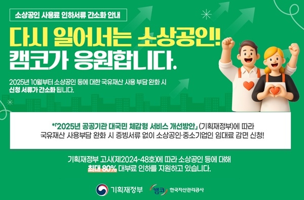 기존에는 소상공인이 국유재산 사용료 인하를 신청할 때 ‘소상공인 또는 중소기업인 확인서’를 제출해야 했으나, 앞으로는 캠코의 자체 업무시스템 내에서 사업자등록번호의 조회만으로 자격요건 확인이 가능해졌다.