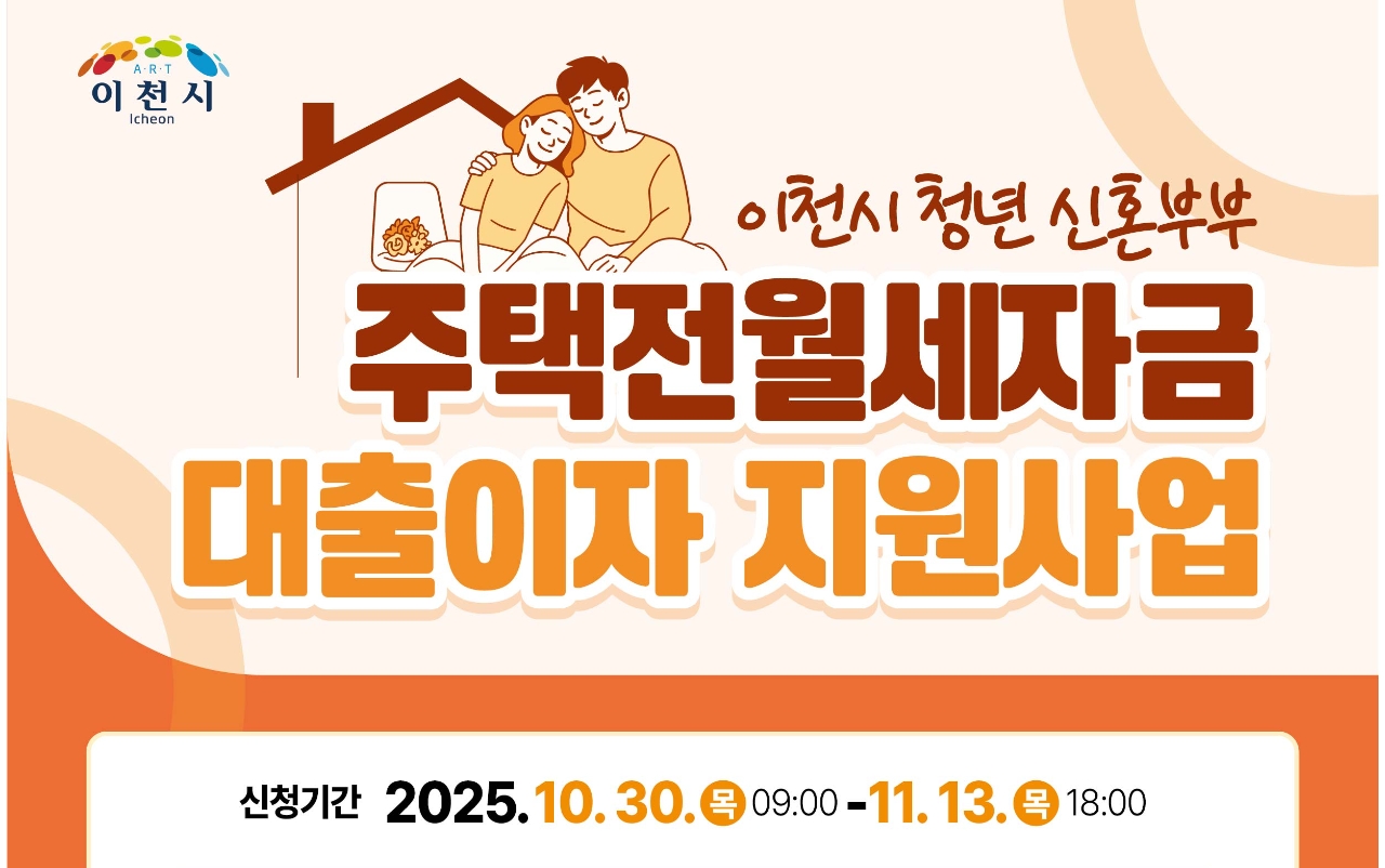 지원 대상은 부부 모두 이천시에 주소를 두고, 부부 중 1명 이상이 만 19세~39세(1986~2006년생)이며 세대 합산 연소득이 8천만 원 이하인 무주택 신혼부부다.