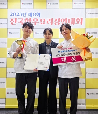 이미지 확대보기경남정보대 호텔외식조리학과 이재원·노동진 학생팀(지도교수 조은주)은 ‘한우 우둔살 타르타르와 한우 등심 웰링턴’을 출품해 전문성과 창의성을 인정받아 대학부 최고상인 농림축산식품부 장관상(대상)을 수상했다.