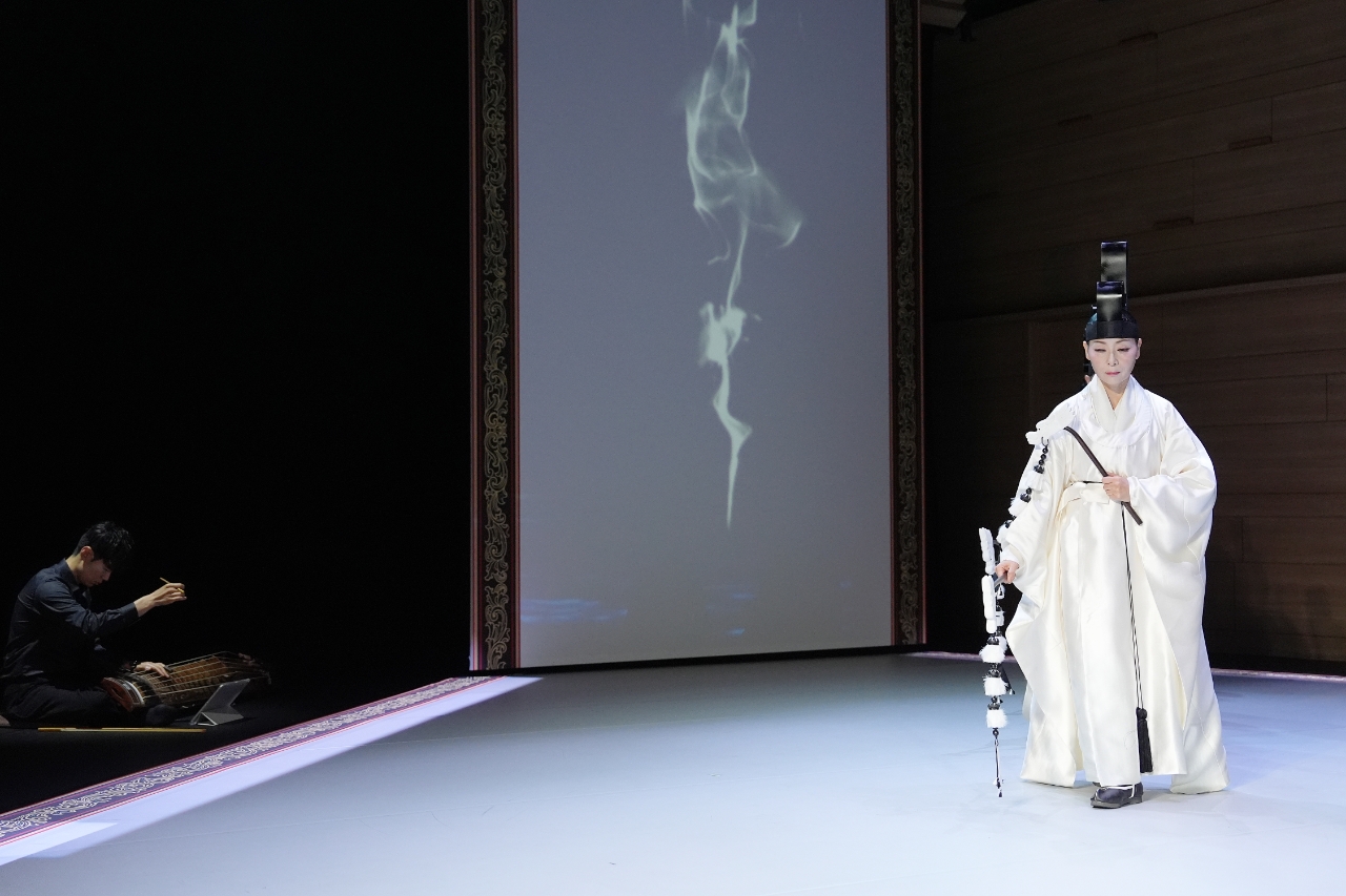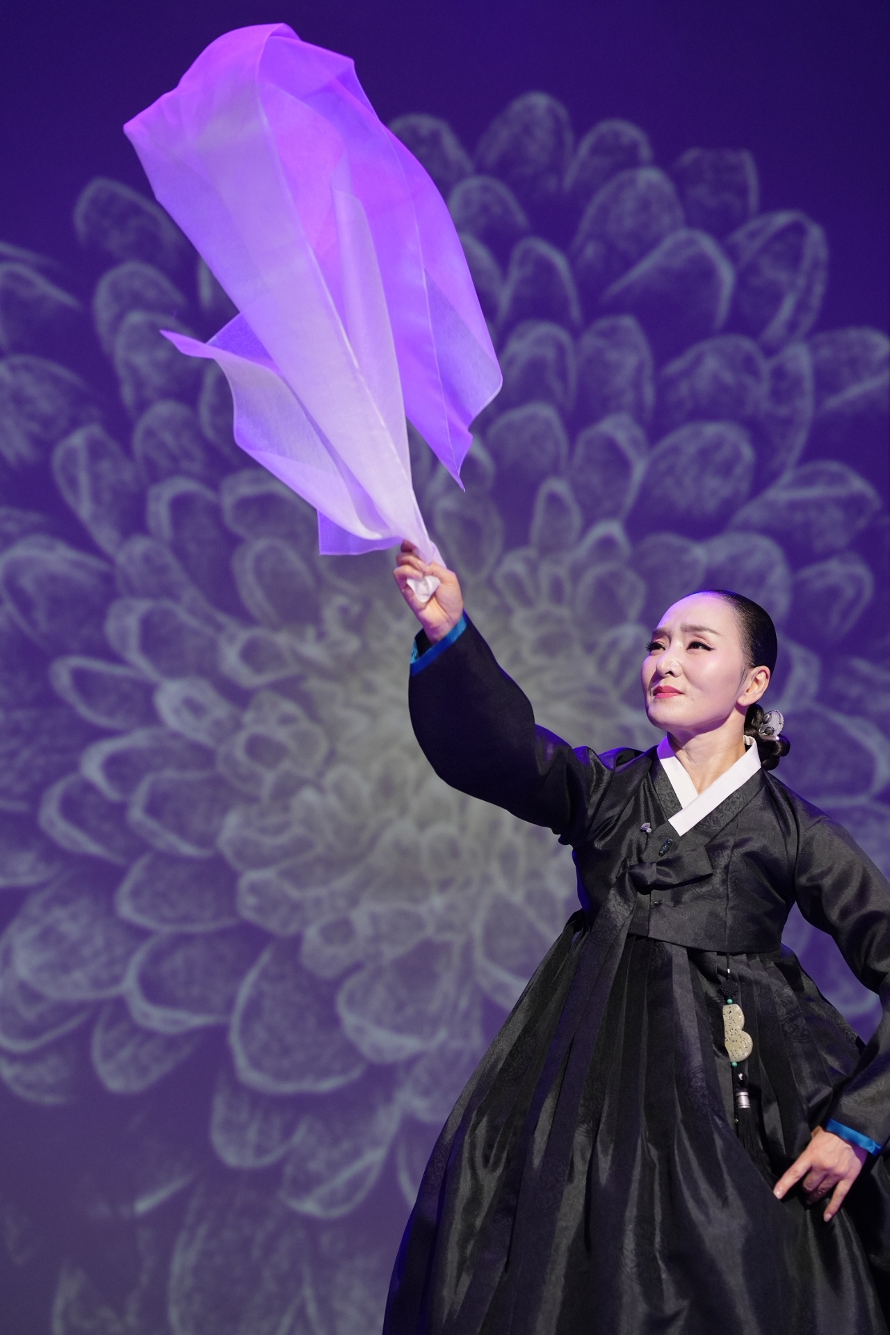 ‘송신(送神)의 춤’ : 불러온 혼을 돌려보내며 신성한 세계와 속세의 경계가 다시 닫힌다. 초청(청신)–교류–송신의 구조 속에 살풀이춤의 긴 자락은 떠나간 이를 향하고, ‘잘 돌아가시라’를 행위로 청한다. 이별은 잊음이 아니라 다른 방식으로 함께 있음을 모색하는 과정이다. 춤은 보내는 이의 마음을 감각화 한다. 춤은 기억과 감각 속에서 지속되는 변형된 관계로 나타난다. 김보라의 정가와 윤보람의 첼로가 슬픔을 침화시킨다. 감동적인 효심의 이별이었다.