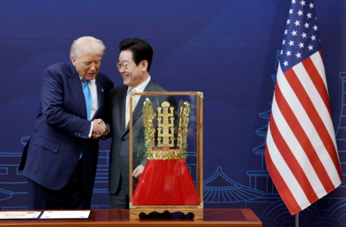 이미지 확대보기29일 두 대통령은 국립 경주박물관에서 확대 오찬 겸 정상회담을 가졌다. 회담에 앞서 이 대통령은 트럼프 대통령에게 미국 대통령 최초로 한국 최고 훈장인 무궁화 대훈장을 수여하고 신라 천마총 금관 모형을 선물했다.