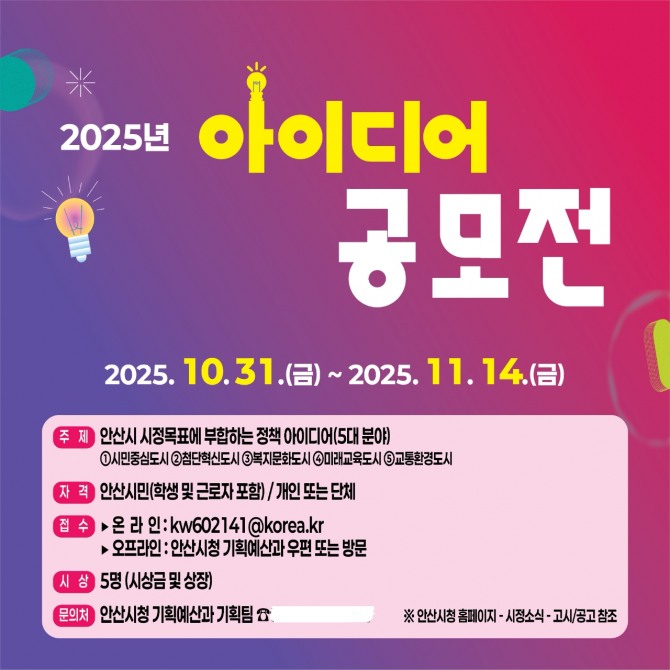 자세한 사항은 안산시청 누리집 ‘새소식’ 또는 ‘고시공고’란에서 확인할 수 있으며 시 기획예산과에 전화로도 문의 가능하다.
