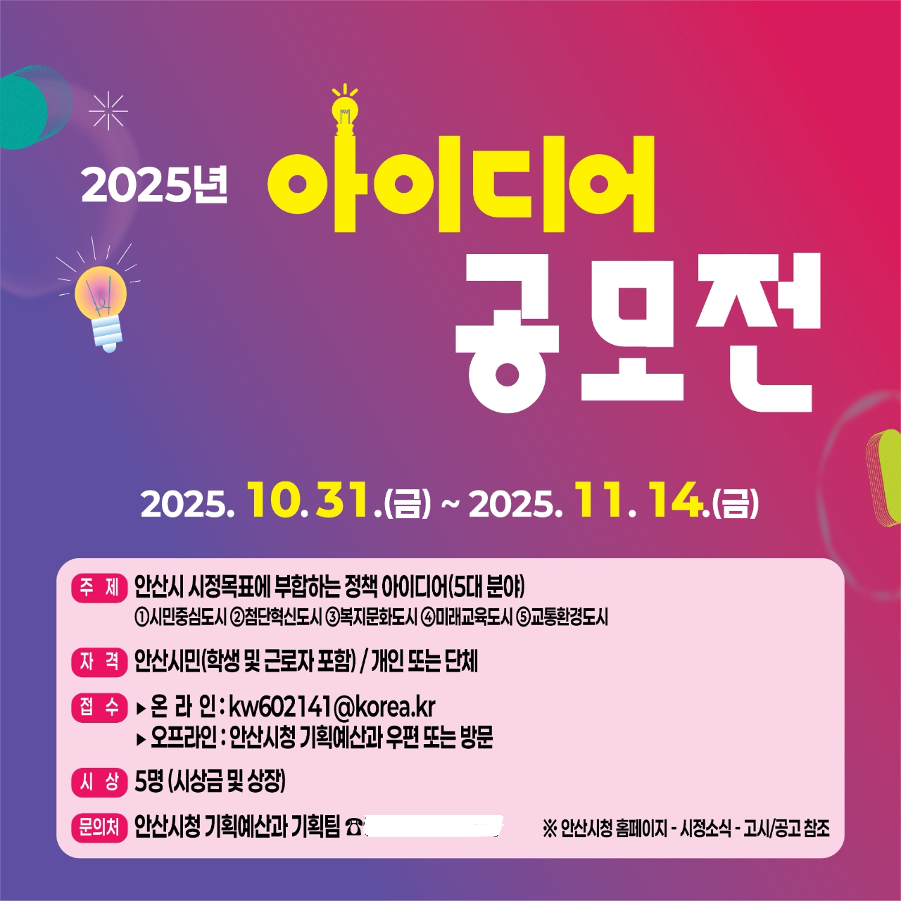 이미지 확대보기공모 주제는 안산시 5대 시정목표(늘 가까운 시민중심도시, 더 젊은 첨단혁신도시, 함께 행복한 복지문화도시, 더 멀리보는 미래교육도시, 쾌적한 교통환경도시)에 부합하는 정책과 시 발전을 위한 타 지자체와 차별화된 정책이다.