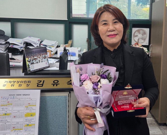 지난 달 28일‘2025 지방자치 의정 대상’에서 기초의원 부문 대상을 받은 김유숙 안산시 의원. 사진=김유숙 의원이미지 확대보기