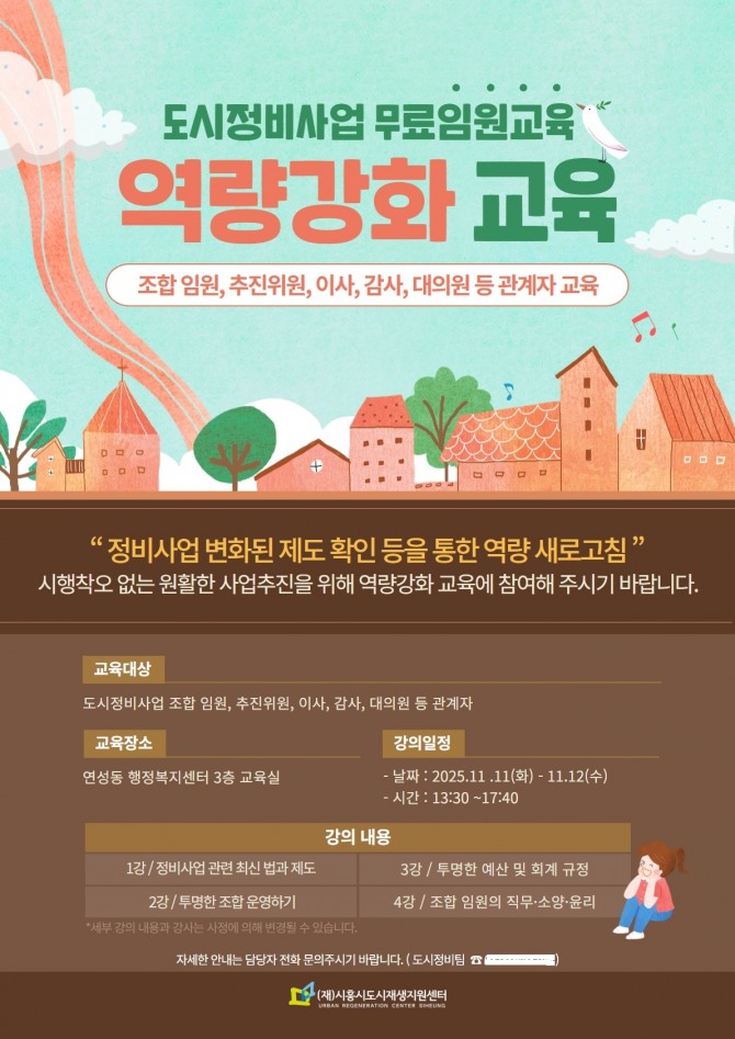 도시정비사업 관련 교육에 대한 문의는 (재)시흥시도시재생지원센터 도시정비팀으로 문의하면 된다.